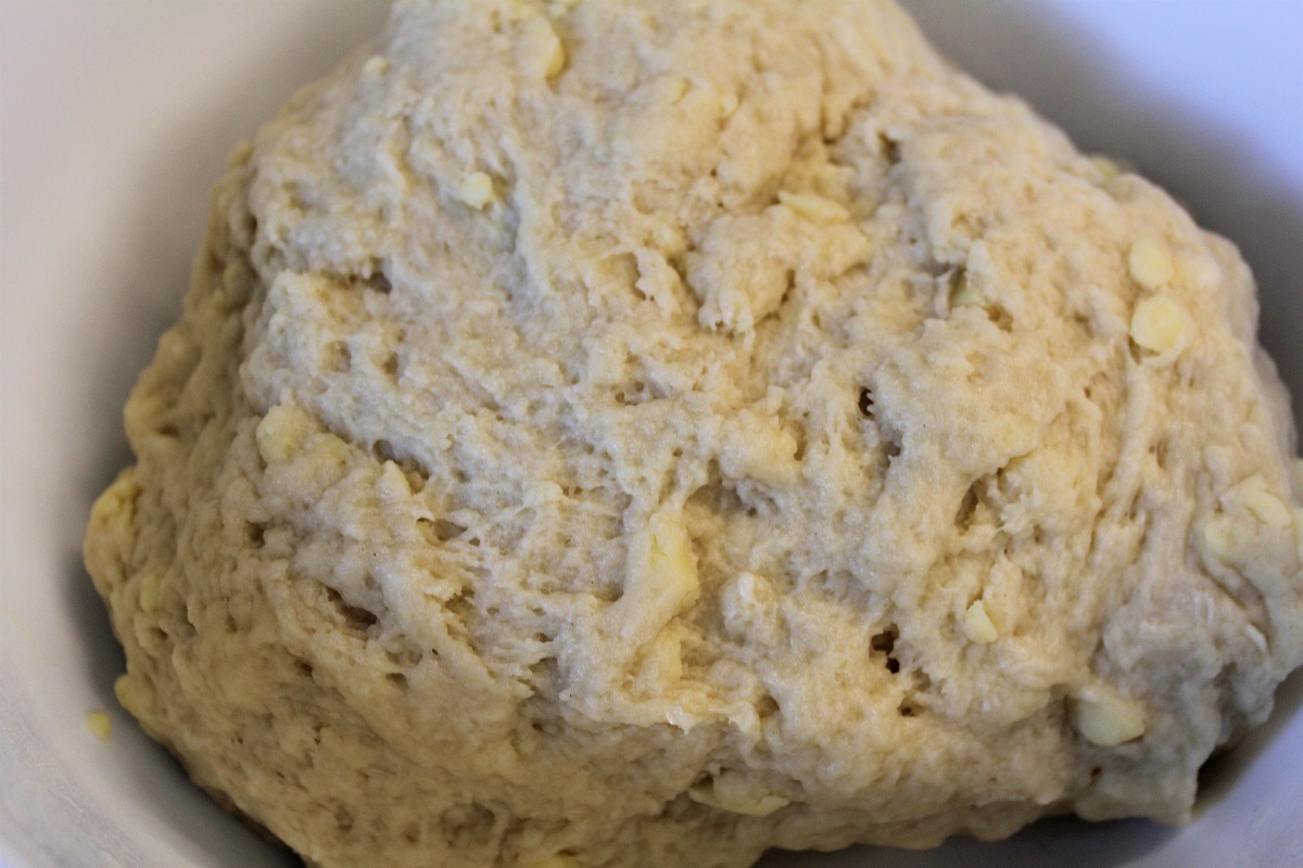 În făina cernută se pun untura sau untul, brînza Cheddar tăiată cubulețe mici, lingurița de sare și apa rece.
